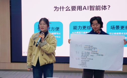 活动下半场聚焦“AI智能体搭建”。丁伟老师鼓励学生上台,结合自身求职需求分享智能体构建设想,学生们围绕专业与求职场景提出不同思路。每轮分享后,丁伟老师也从专业角度点评,帮助学生完善想法。最后,丁伟老师以豆包APP为实操工具,重点介绍求职面试及简历优化智能体的搭建方法,演示适配求职场景的智能体进阶用法,让学生掌握核心搭建逻辑。