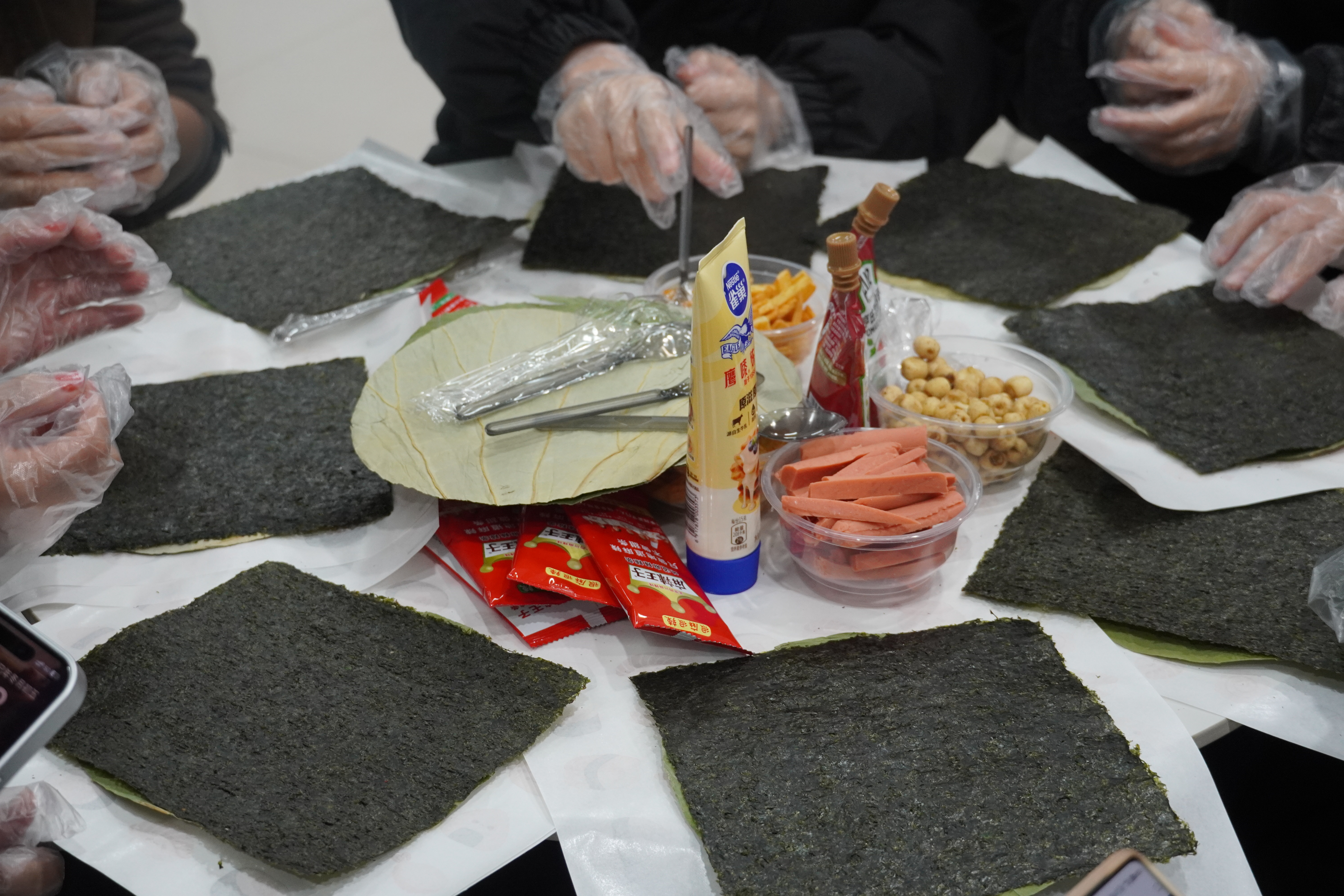 活动伊始,工作人员以荷叶铺展为“天然餐盘”,莲米点缀其中,象征“心连心”的温暖寓意。同学们亲手捏制饭团,将软糯的“湖丰两优105”大米与清香的莲米、火腿、黄瓜等食材创意组合,每一步制作都成为专注当下、释放压力的过程。