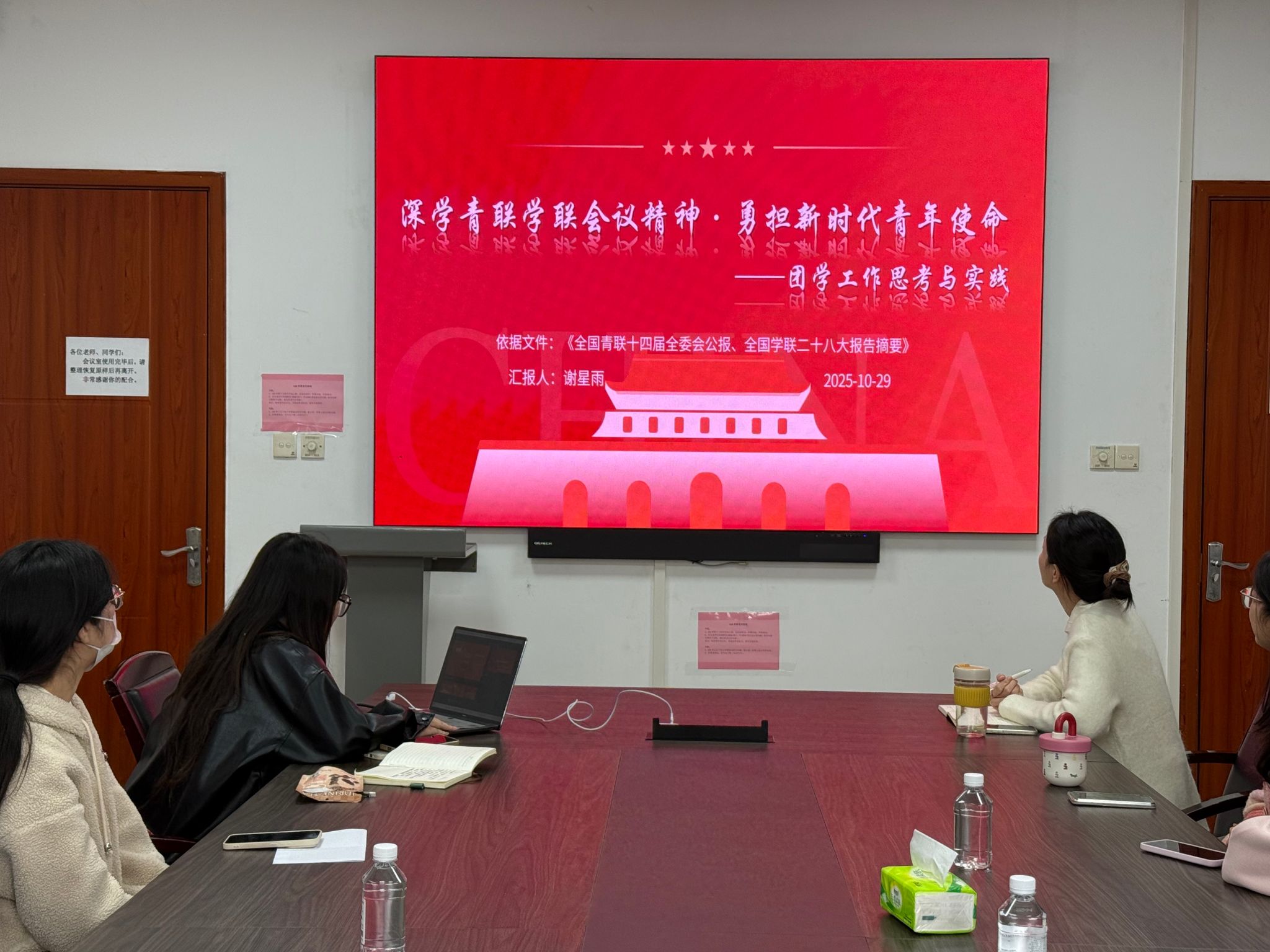 随后,参会骨干结合自身工作岗位,围绕“如何将青联学联精神融入团学实践”展开交流探讨,分享学习感悟与工作思路,针对活动策划、思想引领、服务同学等方面的实践方向交换意见,进一步明晰了团学工作的发力点。会议最后,团委书记徐墨对后续工作进行安排,要求各部门以会议精神为指引,深化理论学习成果,加强部门协作,打造贴合青年需求、彰显学科特色的团学活动,切实提升服务效能。