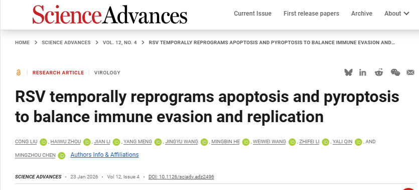 近日,威廉williamhill官网病毒学和疫苗研究中心陈明周教授团队继续在呼吸道合胞病毒(RSV)的机制研究中取得新的突破,在Science子刊《Science Advances》上发表了题为“RSV Temporally Reprograms Apoptosis and Pyroptosis to Balance Immune Evasion and Replication”的研究论文。该研究系统阐明了呼吸道合胞病毒(RSV)在感染不同阶段对细胞凋亡与细胞焦亡时空动态调控机制,揭示了程序性细胞死亡过程的时序性调控在呼吸道合胞病毒复制、传播及宿主炎症反应中的关键作用。