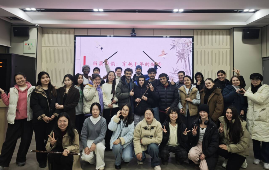 活动伊始,笛箫协会会长朱鸿宇便以一曲婉转动听的《青花瓷》吸引了留学生的注意,大家不约而同拿出手机录像,纷纷拍手叫好。随后协会成员以生动风趣的语言,为留学生们娓娓道来笛箫的历史渊源与文化内涵。从古老的骨笛传说,到唐宋诗词中“谁家玉笛暗飞声,散入春风满洛城”的悠远意境,再到笛箫名曲以及吹奏技法,一个个鲜活的故事、一段段深厚的底蕴,让在场留学生们听得入神,为中国传统乐器的魅力所折服。